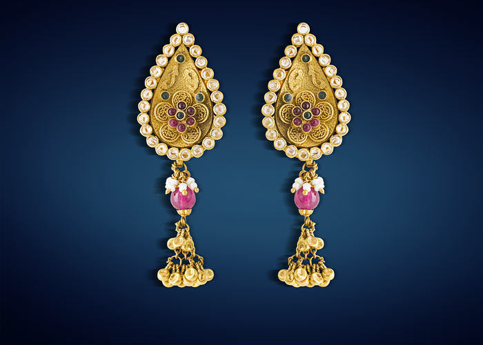 A jhumka adorned with ruby and emerald cabochons on a pear-shaped intricately designed gold motif along with tinkerbells of gold for a perfectly traditional look.