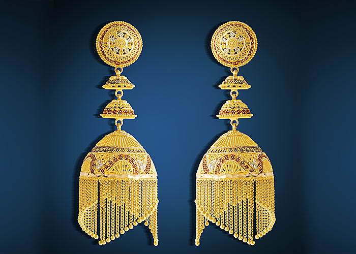 A golden dome shaped jhumka with intricate designs on its body with a series of small gold chains giving a completely traditional look.